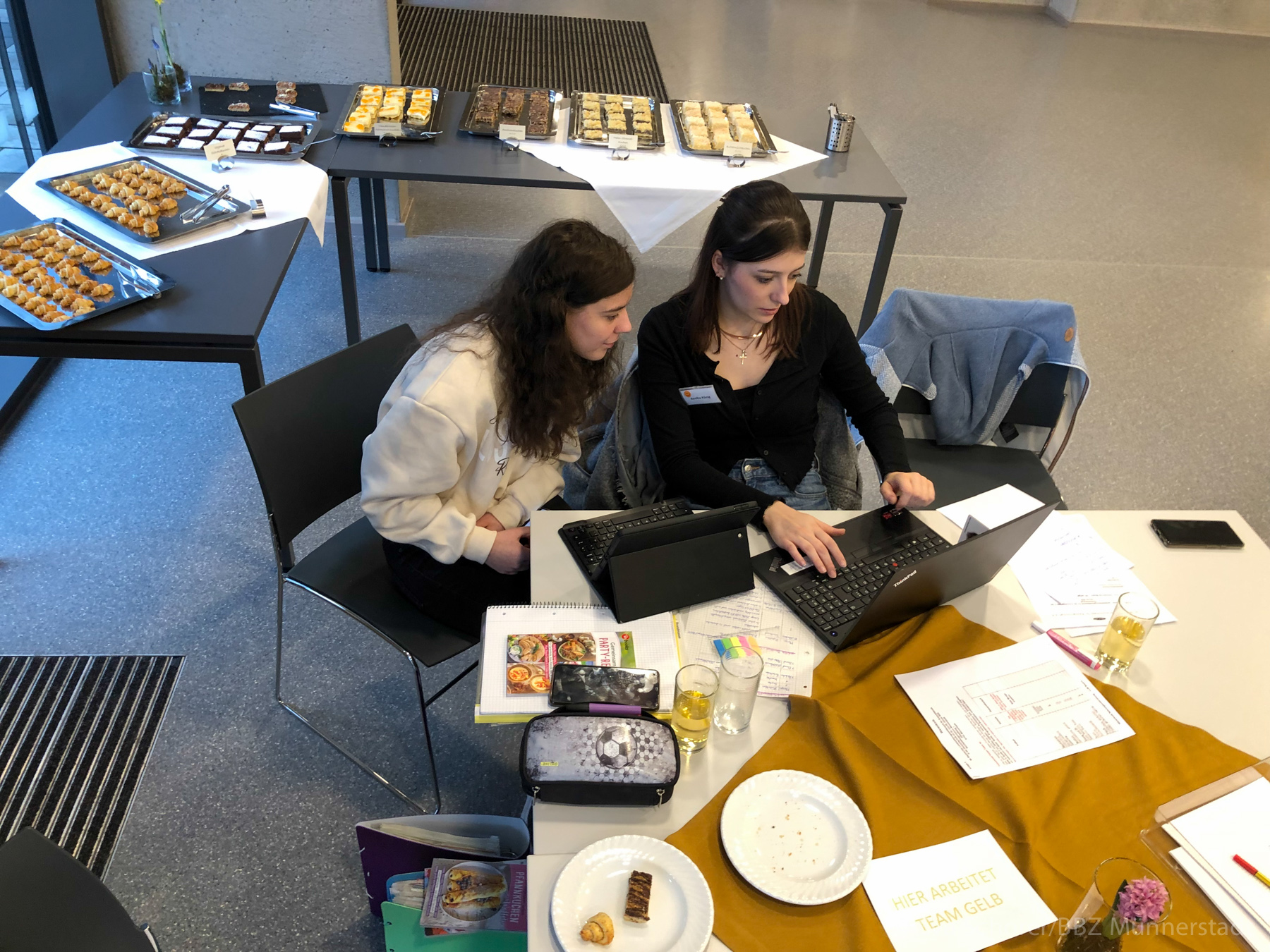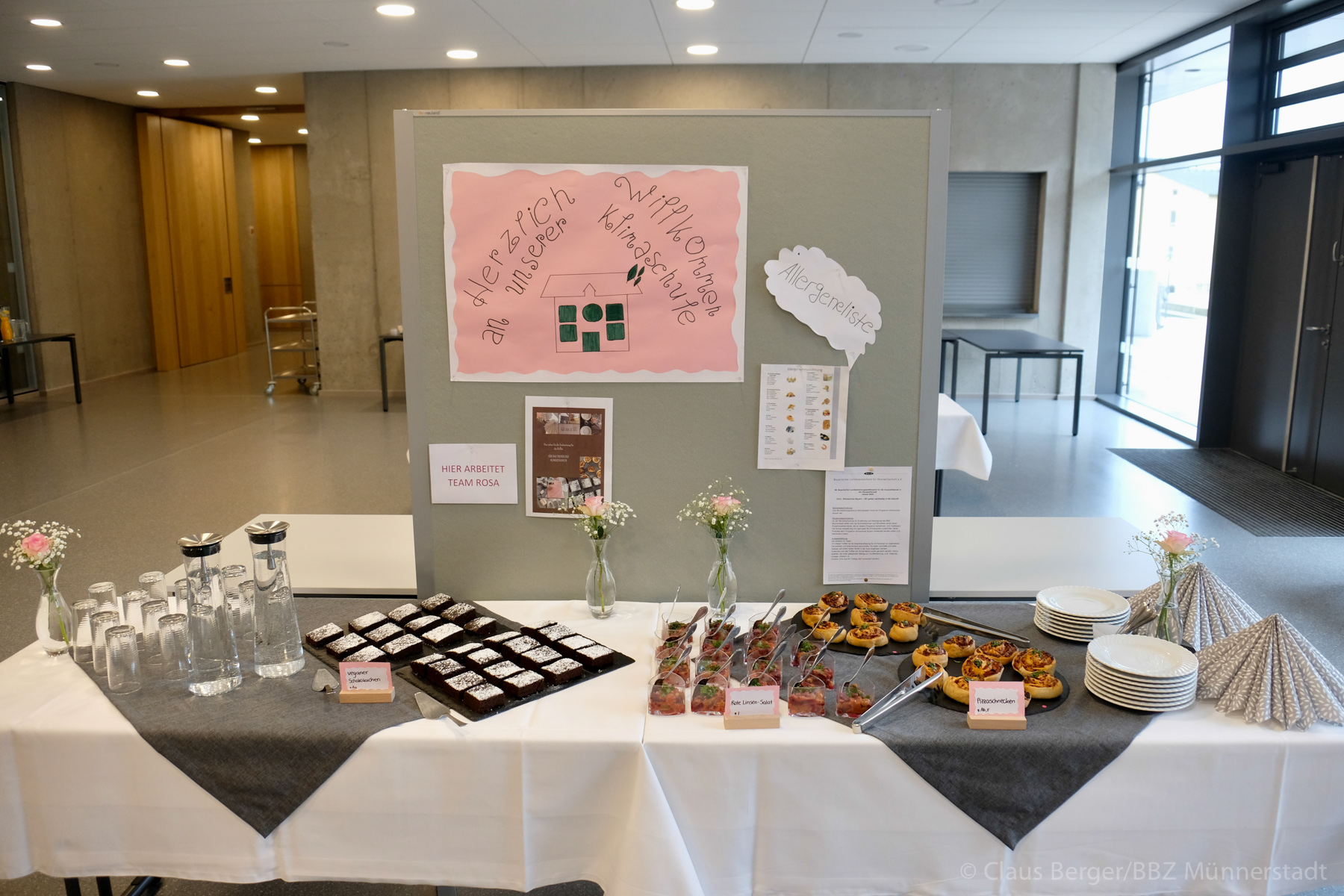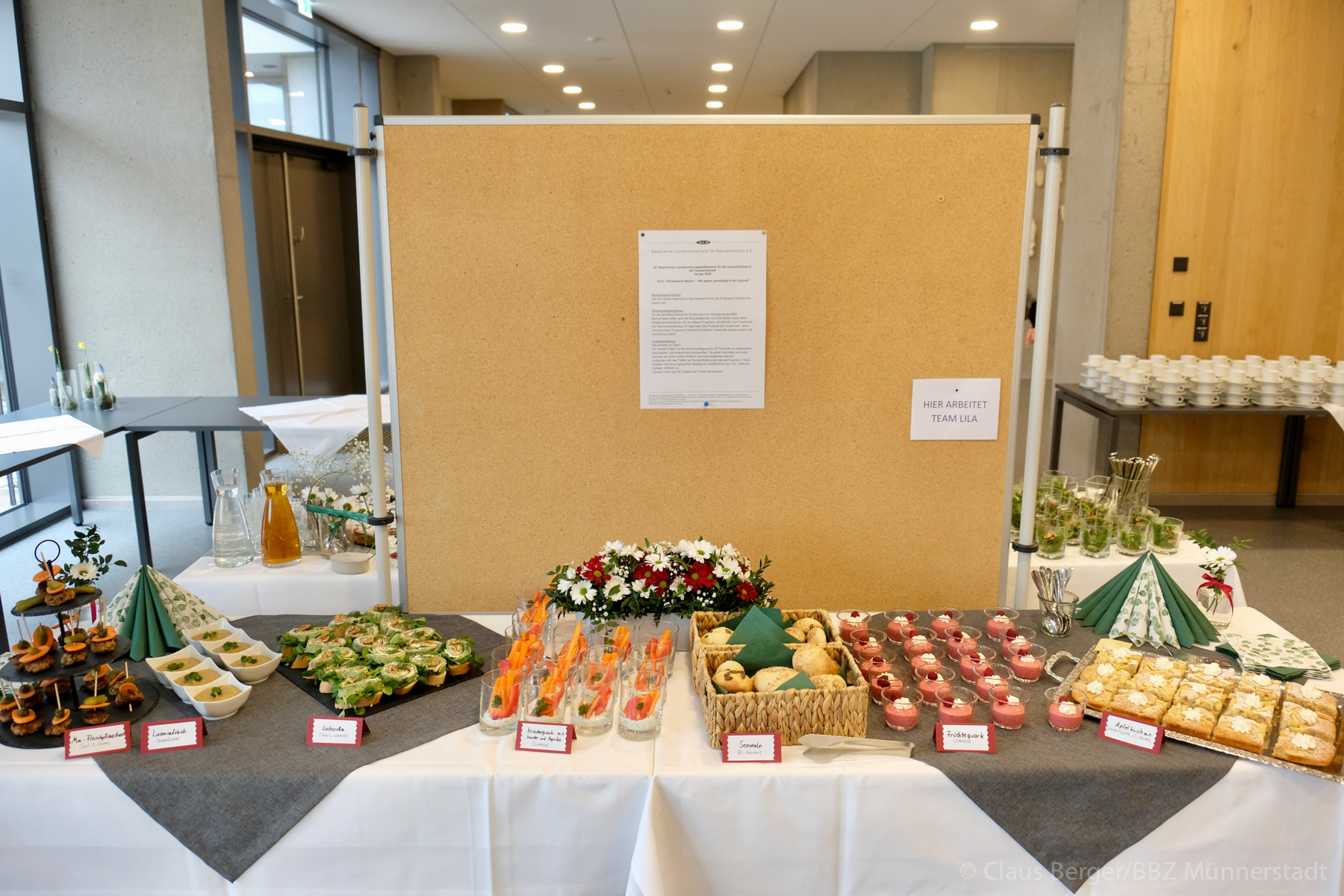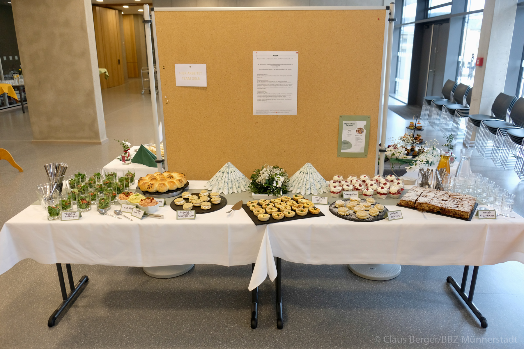 Am Samstagvormittag führten die Teams die geplanten Aufgaben dann in den modernen Räumen des BBZ aus. Für alle Beteiligten (Teilnehmer/innen, Jurorinnen, Verantwortliche) bereiteten Schüler/innen der Münnerstädter BFS für Ernährung und Versorgung ein leckeres Mittagessen, so dass man gestärkt die Tische mit dem Wettbewerbsergebnissen aufbauen und dem Ankommen der Gäste entgegensehen konnte.