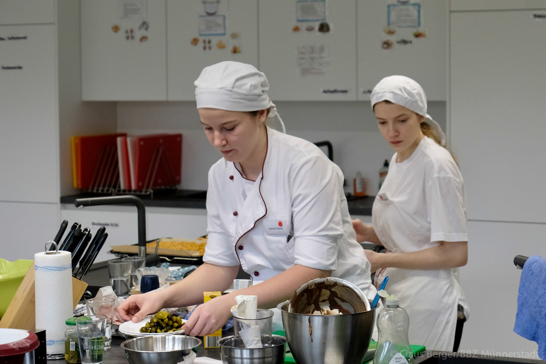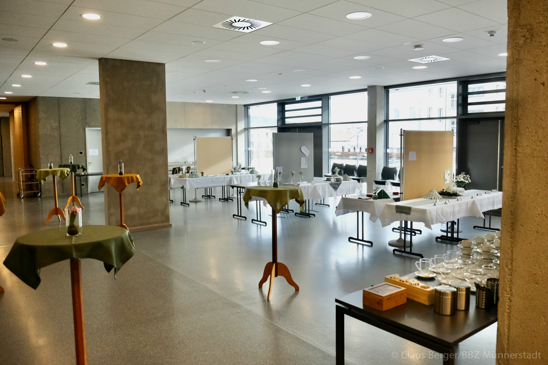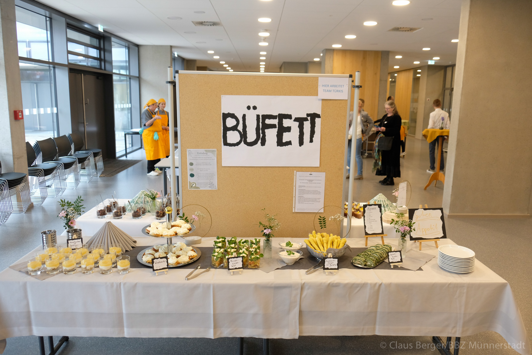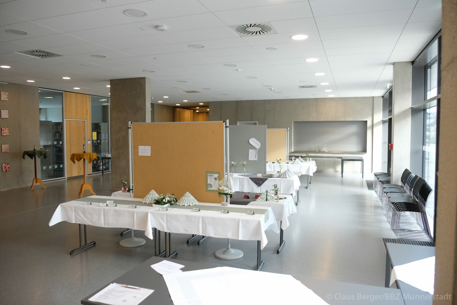 Am Samstagvormittag führten die Teams die geplanten Aufgaben dann in den modernen Räumen des BBZ aus. Für alle Beteiligten (Teilnehmer/innen, Jurorinnen, Verantwortliche) bereiteten Schüler/innen der Münnerstädter BFS für Ernährung und Versorgung ein leckeres Mittagessen, so dass man gestärkt die Tische mit dem Wettbewerbsergebnissen aufbauen und dem Ankommen der Gäste entgegensehen konnte.