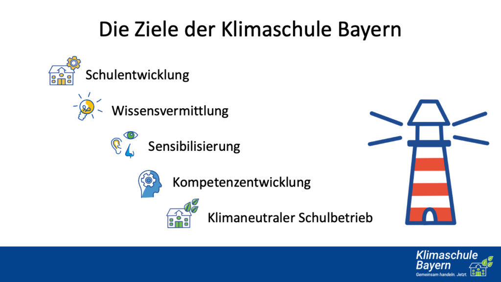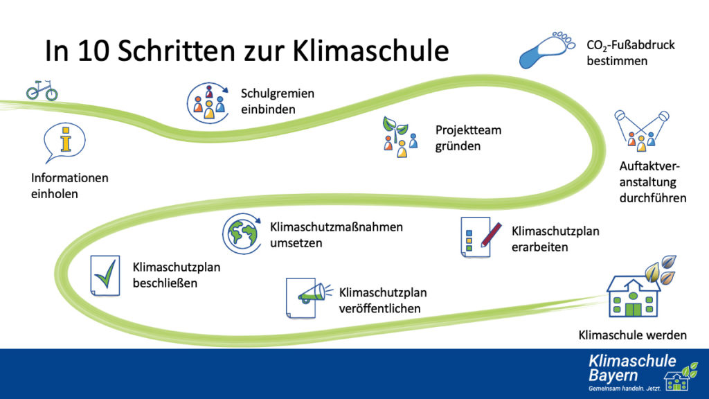 Das Programm Klimaschule Bayern ist ein Kooperationsprojekt des Kultus- mit dem Umweltministerium, durch das Schulen aktiv das Pariser Klimaschutzabkommen unterstützen können. Das bedeutet konkret: Der Temperaturanstieg soll im globalen Mittel möglichst auf 1,5°C seit 1850 begrenzt und die Klimaneutralität weltweit erreicht werden.
