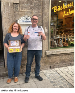 Der Mittelkurs stellte 450 Samentütchen mit Sonnenblumenkernen her – als Symbol dafür, dass Teilhabe Pflege und Engagement braucht. Die Sonnenblumensamen konnten dank einer Spende beschafft werden, die Papiertütchen und dazu passende Postkarten wurden im Unterricht selbst gestaltet. Die Samentütchen liegen zusammen mit den selbst gestalteten Postkarten in lokalen Geschäften aus. Außerdem machen Aktionsplakate im Schaufenster auf die Aktion aufmerksam. Wer in Münnerstadt unterwegs ist, kann die Aktionswoche kaum übersehen: Neben der Präsenz in vielen lokalen Geschäften wurde an der Seger-Kreuzung ein großes Bauzaun-Banner angebracht, ein weiteres hängt am Eingang des BBZ.