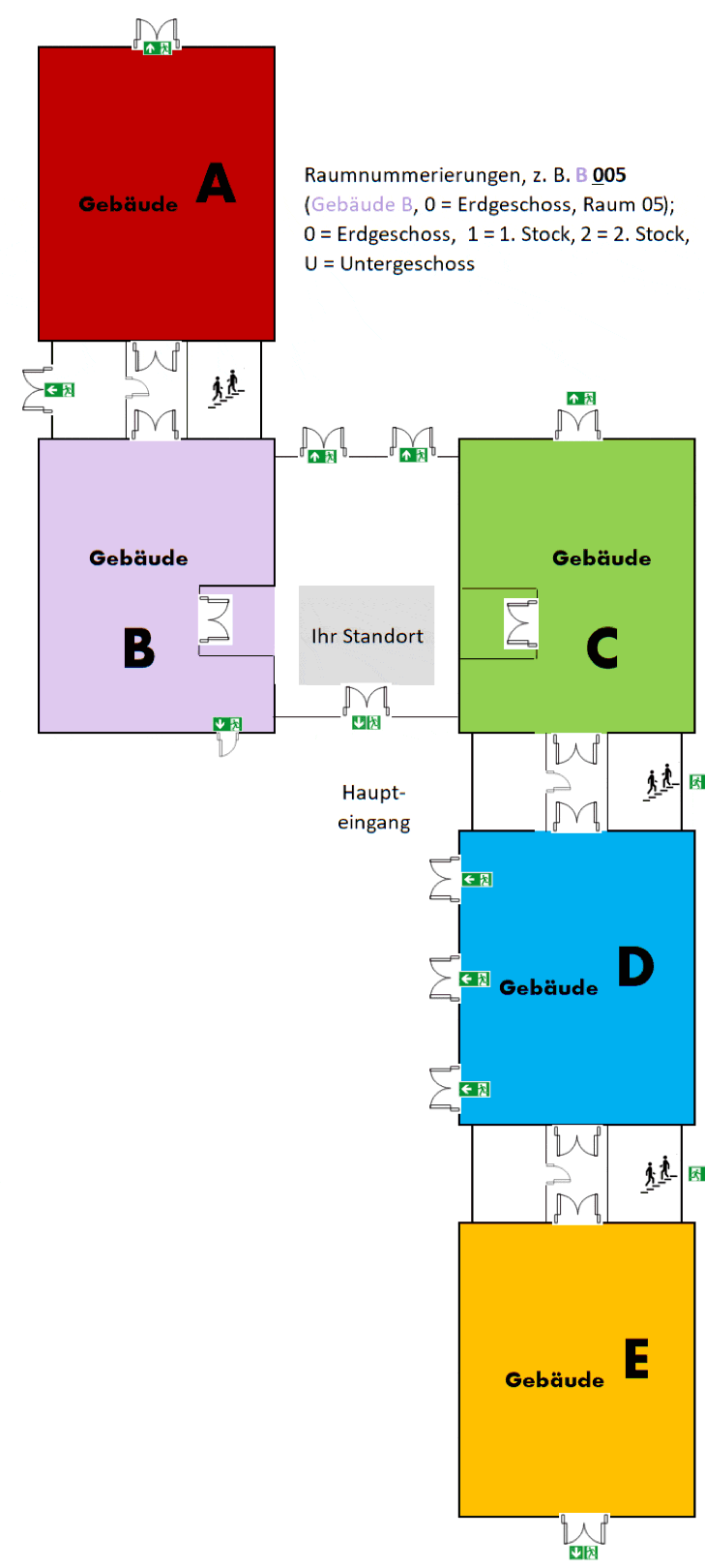 Dieser Grundriss hilft Ihnen, sich im neuen Schulgebäude zurechtzufinden.